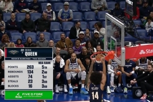 轉(zhuǎn)播方給出了一組新秀數(shù)據(jù),首輪13號秀奎因本賽季總得分(第五)、籃板(第二)、助攻(第一)、搶斷(第三)和蓋帽(第三)皆在2025屆新秀前五。