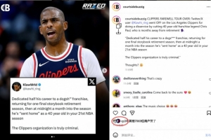 在為這支表現(xiàn)不佳的球隊(duì)奉獻(xiàn)了職業(yè)生涯一半的時(shí)間后,克里斯·保羅本打算回到快船隊(duì),以一個(gè)完美的賽季結(jié)束自己的籃球生涯。然而,在賽季開(kāi)始僅一個(gè)月后,這位即將退役的老將卻在深夜被球隊(duì)“送回家”。這一舉動(dòng)引發(fā)了球迷的強(qiáng)烈不滿,有球迷在推特上直言:“快船管理層的行為簡(jiǎn)直是犯罪。”