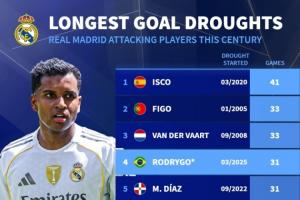 據(jù)德轉(zhuǎn)統(tǒng)計(jì),羅德里戈31場球荒場數(shù)在本世紀(jì)皇馬進(jìn)攻球員上可以排到第4位,僅次于伊斯科、菲戈和范德法特的球荒場數(shù)。
