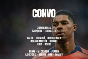體育資訊12月6日訊 北京時(shí)間明天凌晨1點(diǎn)30分,巴薩將在西甲第15輪比賽中客場(chǎng)對(duì)陣貝蒂斯,巴薩公布了此役的球員名單,費(fèi)爾明、德容回歸,奧爾莫、阿勞霍、加維缺席。