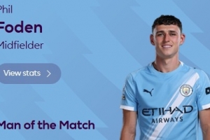 賽后,英超官方確認(rèn)福登當(dāng)選本場比賽的MVP。