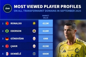 體育資訊10月5日訊 德國轉(zhuǎn)會(huì)市場(chǎng)列出了9月份球員頁面瀏覽量排名,C羅居首,埃德森、京多安二三位,梅西排名第7位。