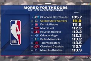 過去三場(chǎng)比賽勇士失分是99/94/91;目前他們防守效率111.9,聯(lián)盟第二僅次于雷霆。