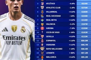 體育資訊10月5日訊 德轉(zhuǎn)此前更新了西甲球員身價(jià),并盤點(diǎn)了目前西甲球隊(duì)身價(jià)榜,具體如下: