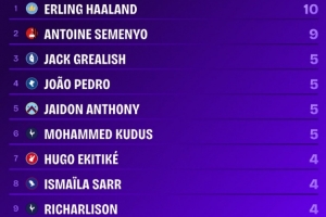 體育資訊10月6日訊 英超第7輪比賽,曼城以1-0的比分小勝布倫特福德。本場比賽,哈蘭德打進全場唯一進球,成為本賽季英超首位直接參與10粒進球的球員。