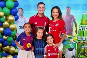 庫(kù)蒂尼奧為兒子慶祝生日,一家人身穿國(guó)米、利物浦、巴薩和拜仁的球衣,這都是庫(kù)蒂尼奧在歐洲效力過(guò)的俱樂(lè)部。
