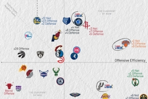 橫軸代表進(jìn)攻效率,越靠右越好,縱軸代表防守效率,越靠上越強(qiáng)。第一象限的球隊多為發(fā)揮出色的球隊,而在第三象限的球隊通常為戰(zhàn)績比較糟糕的球隊。