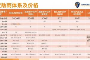 其中,2026賽季云南玉昆設立了1個冠名合作伙伴席位,參考價值3000萬元,而其他各檔贊助席位則從10萬-500萬元不等。