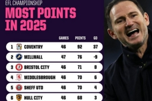 體育資訊12月31日訊 數(shù)據(jù)網(wǎng)站OPTA盤點了2025全年英冠積分榜,其中蘭帕德率領的考文垂積分92分,比排在次席的米爾沃爾多出16分,凈勝球更是高達37球。