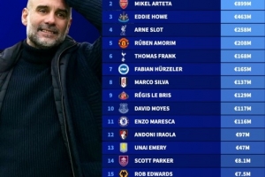 體育資訊1月1日訊 切爾西主帥馬雷斯卡在新年當(dāng)天離任,德國轉(zhuǎn)會(huì)市場(chǎng)盤點(diǎn)了英超主帥引援凈投入排行,瓜迪奧拉10.3億歐居首,馬雷斯卡1.16億歐位居第11位。