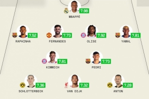 前衛(wèi):拉菲尼亞(巴薩,7.52分)、B費(曼聯(lián),7.73分)、奧利塞(拜仁,7.92分)、亞馬爾(巴薩,7.81分)