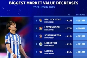 體育資訊1月2日訊 2025年已經(jīng)結(jié)束,《轉(zhuǎn)會(huì)市場(chǎng)》也統(tǒng)計(jì)了年度球隊(duì)身價(jià)貶值榜,皇社、藥廠分列前二。