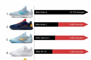 體育資訊1月2日訊 球鞋媒體kixstats統(tǒng)計(jì)了12月份NBA球員上腳球鞋的總時(shí)長(zhǎng)排行,其中科比的兩款球鞋排名前二,Kobe 6依舊是斷檔第一。WNBA球星約內(nèi)斯庫(kù)的Sabrina 3排名第三。