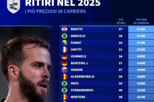 體育資訊1月3日訊 德國(guó)轉(zhuǎn)會(huì)市場(chǎng)統(tǒng)計(jì)了2025年退役球員的歷史最高身價(jià),并列出榜單,拉基蒂奇、馬塞洛、皮亞尼奇、烏姆蒂蒂7000萬(wàn)歐居首。