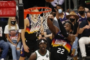 2021年總決賽,艾頓場均14.7分12籃板1.5蓋帽,布克場均28.2分3.5籃板4助攻,保羅場均21.8分2.7籃板8.2助攻。